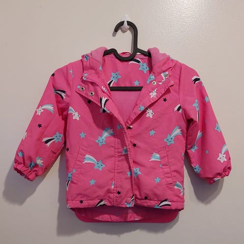 Sininen talvi takki hupulla ja vaaleanpunaisia kukkia