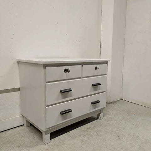Tyylikäs 50-luvun vintage lipasto myytävänä. Kunto ikäisekseen hyvä. Avain tallessa lukot toimivat avainta painamalla hieman alaspäin käännettäessä. Runko kaikin puolin tukeva. Vetolaatikoiden sisällä jälkiä, ei hajuja.