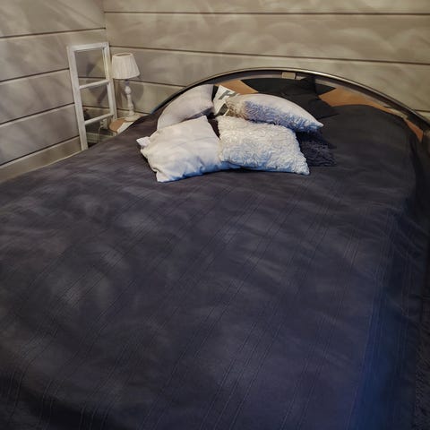 Kahden hengen sänky, joka koostuu kahdesta vierekkäin asetetusta runkopatjasta, leveys yhteensä 160 cm. Runkopatjoissa on beige kangasverhoilu ja mustat puujalat. Kissa on tehnyt tuhoja runkopatjojen verhoilulle, joten siellä täällä on langannousuja ja -pätkiä näkyvissä. Kuvista käy ilmi, ja saa tulla itse tarkastamaan lähempää.