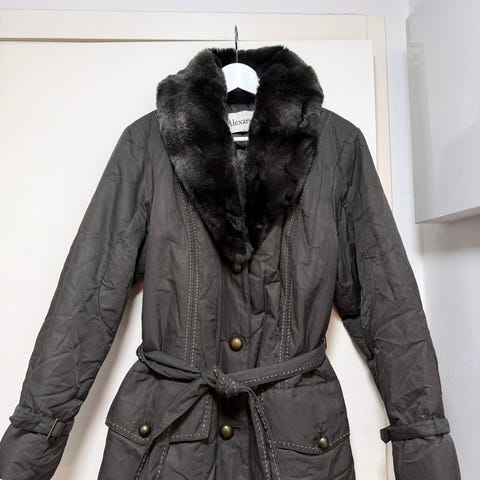 Alexandra Collection naisten talvitakki, väri beige, koko XXL (48). Pitkä, vyötäröltä säädettävä malli, jossa irrotettava tai alas taittuva huppu ja tekoturkisreunus. Edessä vetoketju ja painonapit, sekä sivutaskut. Takki sopii kylmään säähän ja arkikäyttöön.