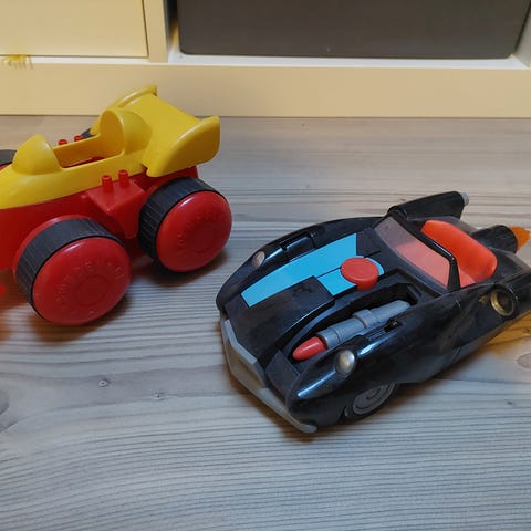 Autot elokuvasta auto ja formula-auto. Formula-autoa voi ajaa kumminkin päin. Autot autossa edessä ”vipu”, jolla etupyörät voi kääntää jompaankumpaan suuntaan. Molemmissa käytönjälkiä.