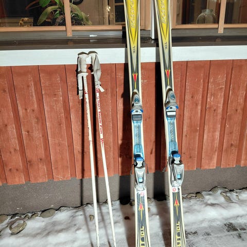 Rossignol laskettelu sukset 130cm. Toisen suksen pohjassa naarmu ja painauma, näkyy kuvassa. Suksien kantit viime talvena teroitettu.