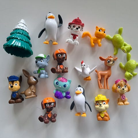 Myydään. Ryhmä Hau pienet muovifiguurit lajitelma. Kokoelmassa on useita eri hahmoja ja värejä, muun muassa samoista koirahahmoista useita kappaleita. Figuurit ovat pieniä muovisia leluja, jotka sopivat esimerkiksi roolileikkeihin ja kokoelmaksi Ryhmä Hau -sarjan faneille. Myydään kuvien mukaisena settinä. Koko paketti kerralla, ei myydä erikseen. Mitat n. 2 x 3,5 x 4,5 cm riippuu siitä onko istuva tai makaava hahmo.