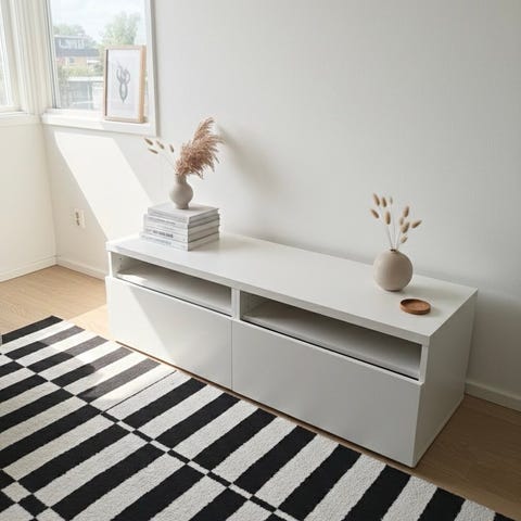 Mitat on arvioitu, minulla ei ole valitettavasti mittaa. Siro tv-taso joka tapauksessa. Hae pois Löfbergs kahvipaketilla.