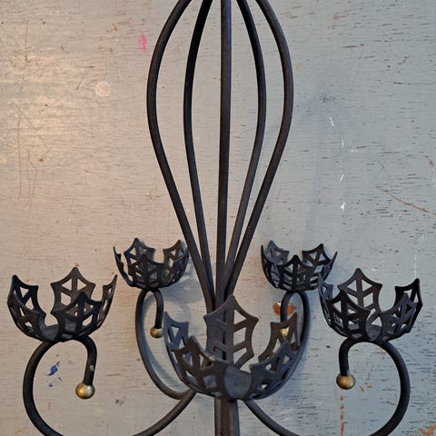 Väri on sellainen kulunut valkoinen. Koukku joka kannattelee kynttelikköä hieman vääntynyt-katso kuva. Vain haku.