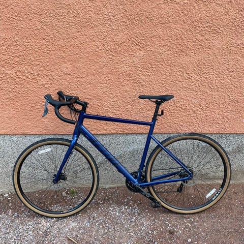 Erinomainen 170-185 cm kuskin yleispyörä sorateille, retkeilyyn ja työmatkoille, kapeammilla kumeilla pärjää maantielenkeilläkin. Kevyt mutta jämäkkä ja siirtää polkijan tehot hyvin suoraviivaisesti vauhdiksi. Juuri vaihdettu mm. ketjut ja vaihdevaijeri. Alla Giant PX2-kiekot ja Continental Contact Spike -nastarenkaat, tilalle voi katsoa kesäkumia myös. Kuvassa satula 171 cm kuskille, kovin paljon lyhemmälle ei ainakaan ilman lyhempää stemmiä mene, mutta ylöspäin on joustoa enemmän.
