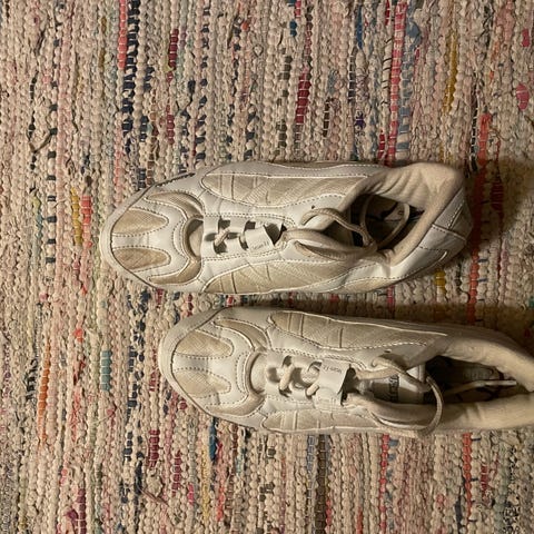 Kaepa cheerleadingkengät, koko EU 38.5, 24.5 cm. Väri valkoinen. Nauhakiinnitys ja matala varsi. Päällinen synteettistä materiaalia ja tekstiiliä, sisäosa pehmustettu. Pohja tasainen ja joustava. Yhdellä lapsella ollut käytössä. Kärjissä hieman kulumaa. Myydään kuvanmukaisessa kunnossa. Nouto Lohikoski/jkl tai mahdollisesti muualla omien menojen mukaan. MMM.