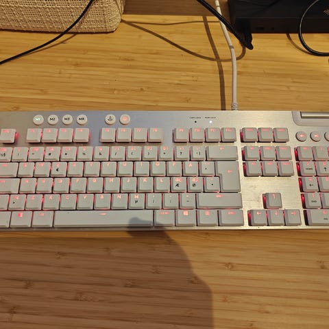 Lähes käyttämätön ja täysin ehjä langaton Logitech G915 mekaaninen näppäimistö Tactile -kytkimillä. Tämä jäi lyhyen kokeilun jälkeen ylimääräiseksi, koska käyttöön tulikin pienempi tenkeyless-versio.