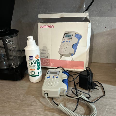 Jumper JPD-100B sikiön sydänäänidoppleri. Laitteessa on digitaalinen näyttö, kaiutin ja irrotettava anturi kierrekaapelilla.