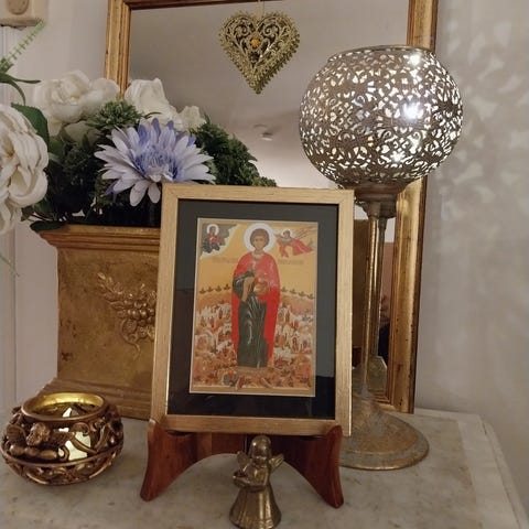 19.5cm x 25.5cm koko vintagekehys on metallia kultasävyä ja kauniisti tehty kuviollinen.. lasipinta suojaa.. laadukas painokuvaa ympäröi paspakehys...palkatta parantaja"pyhä panteleimon"keräilijältä kiertoon ylimääräistä....takana ripustuslanka ..kuvattu oma teline joka ei kuulu mukaan...takana pehmeä mokkatype kangas suoja...erittäin silmäruokainen käytetty puhdas-pölytön