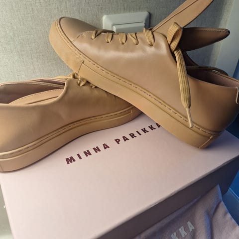 Minna Parikka tennarit, koko 39. Väri vaaleanpunainen glitter-pinta, jossa kiiltävä viimeistely. Nauhakiinnitys edessä. Kantapäässä karvainen yksityiskohta, joka tuo kenkään näyttävän ilmeen. Vaaleanpunainen kumipohja, jossa Minna Parikka -logo. Sopivat arkeen ja vapaa-aikaan tennarityylisiksi kaupunkikengiksi.