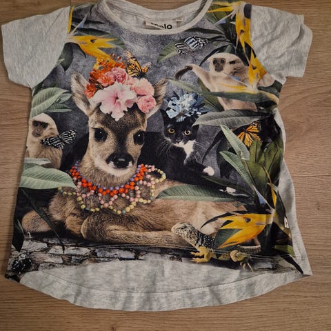 Molo t-paita lapsille. Koko 104, unisex-malli. Harmaa sävy ja edessä katunäkymäprintti tekstillä. Valmistettu puuvillasta. Lyhythihainen, pyöreä pääntie.