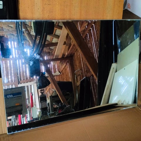 Peilin halkaisija metri. Huomaa kuvasta, että yksi ruuvi takaosasto lähtenyt. Peili on suhteellisen painava.