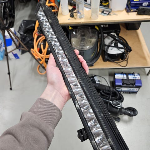 Irroitettu kolaroidusta autosta, siksi naarmua kuvussa (kuvat). Valo oli maskin takana joten ei ottanut suoraa osumaa vaan törmäyspalkki väänsi kiinnikkeet rikki.