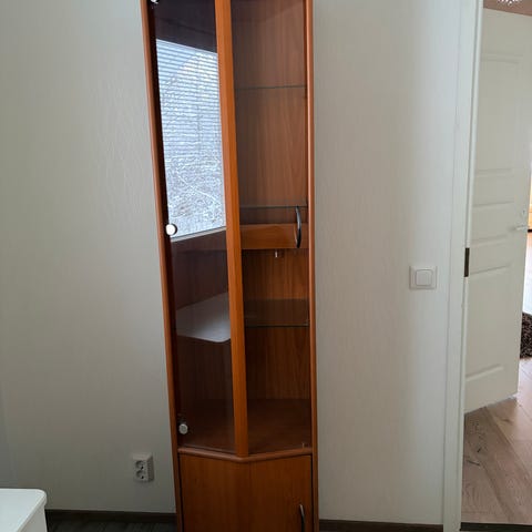 Puunvärinen vitriinikaappi, jossa on lasiovellinen yläosa ja umpiovellinen alaosa. Toisella sivulla on neljän laatikon laatikosto. Sopii esimerkiksi astioiden, kirjojen tai koriste-esineiden säilytykseen. Materiaalina todennäköisesti puuviilu tai laminaatti. Kaapissa on metalliset vetimet ovissa ja laatikoissa.