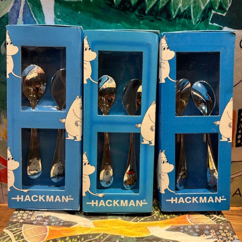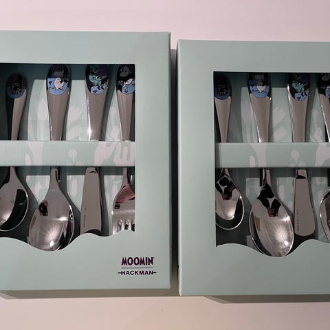 Uusi ja avaamaton paketti, jossa Hackman-merkkiset lasten Muumiaterimet (haarukka, veitsi, lusikka ja pieni lusikka).