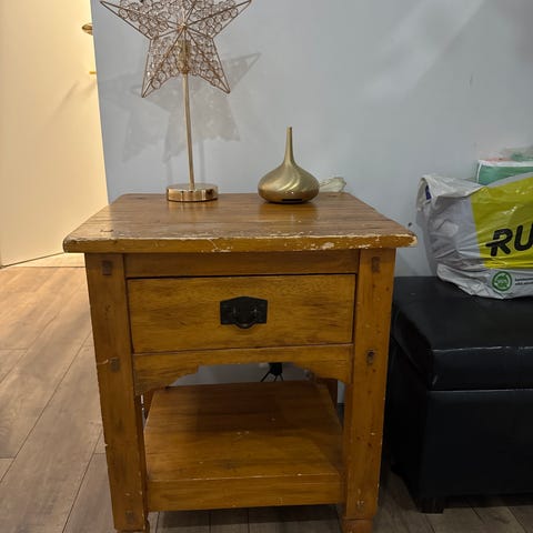 Vaarin vanha yöpöytä / lipasto. Paljon elämisen jälkiä ja kulumaa mutta tukeva.