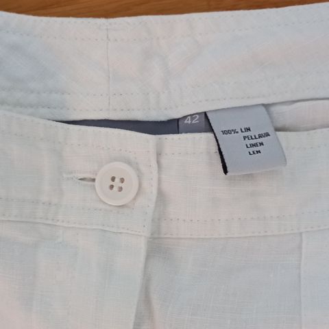 KappAhl housut naisille, koko 42. Väri valkoinen. Materiaali pellavaa, kevyt ja hengittävä. Housuissa vyötärönauha vyölenkeillä ja nappi- sekä vetoketjukiinnitys edessä. Edessä ja takana taskut. Sopivat arkeen ja vapaa-aikaan esimerkiksi t-paidan, neuletakin tai bleiserin kanssa käytettäväksi.