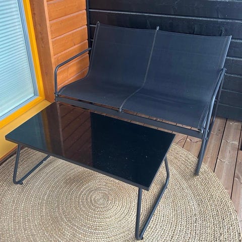 Uudenveroinen Ikean puutarhakalustesetti istuinpehmusteiden kanssa. Noin kolme vuotta vanhat, olleet ainoastaan lasitetulla parvekkeella.
