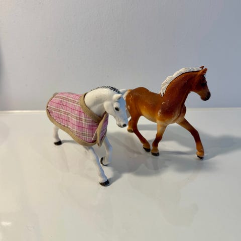 Schleich hevosfiguurit. Pakkaukseen kuuluu kaksi hevosta, joista toisella on irrotettava loimi monivärisellä ruutukuviolla.