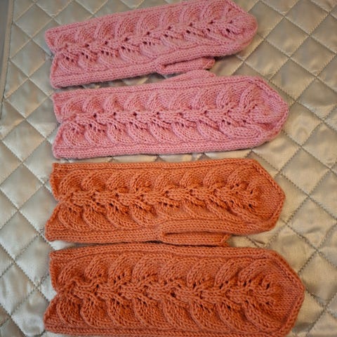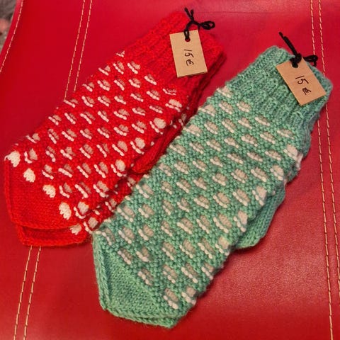 Myydään kauniit, käsinneulotut lapaset upeassa turkoosin ja valkoisen sävyssä.