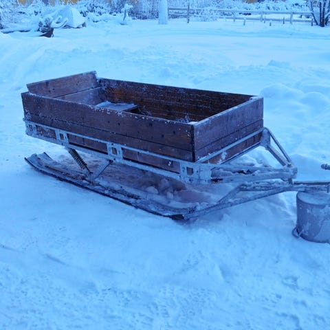Sinkitty runko, jousitus, reki kelkan perään. Pehmustettu istuin, perään on vielä tilava tavara laatikko joka kiinnitetään pulteilla