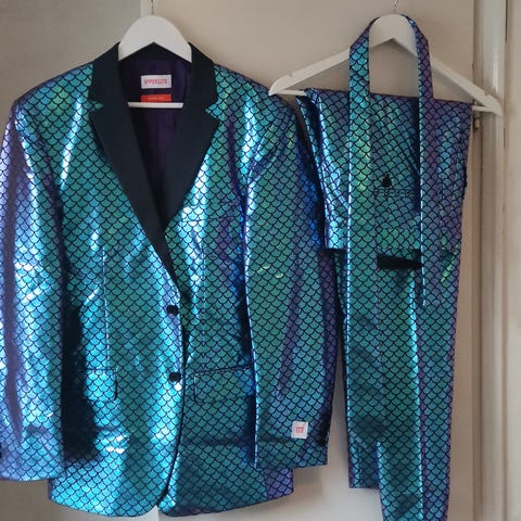 Mittaa takissa ei lue, mutta selän pituus 75cm, hartia 44cm ja hihan sisämitta 46cm. Mukaan tulee koon 94 puvun housut. Lisäksi mukaan tulee myös shampanjan värinen rusetti halutessaan.