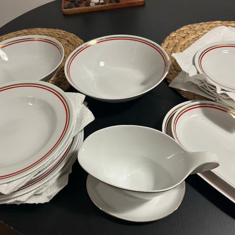 • useita ruoka-, syvä- ja pieniä lautasia