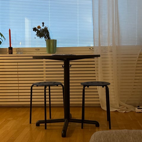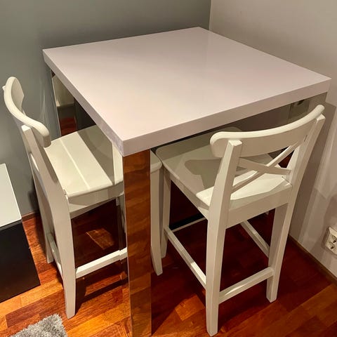 90cm korkea pöytä + 4kpl baarijakkaraa. Pientä elämisen jälkeä pinnoissa, ks. kuvat.