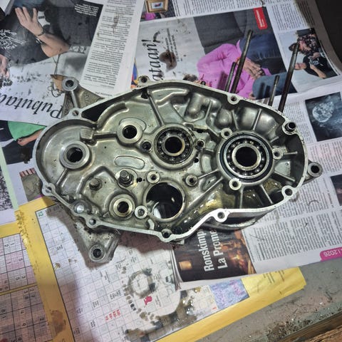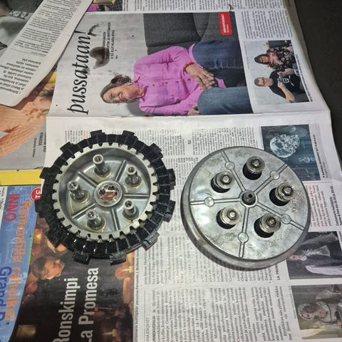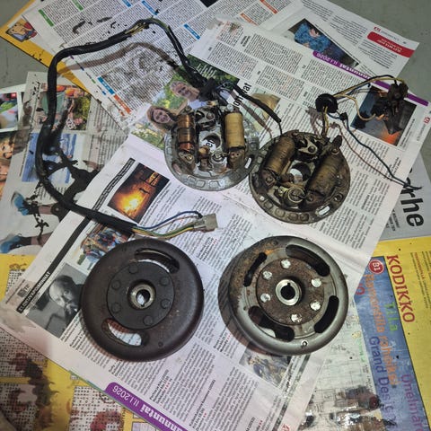 Kahdesta moottorista osia ja rattaita. Kaikkia osia ei välttämättä tallessa.