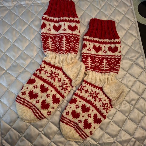Myydään uudet, käsinneulotut villasukat hurmaavalla sydänkuviolla.