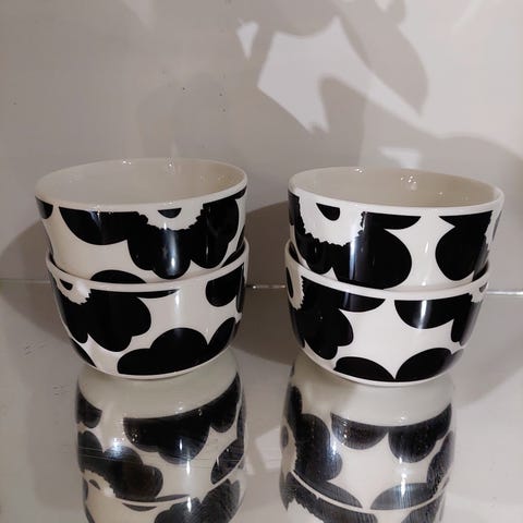 Marimekko Unikko kulho. Valkoinen keramiikkakulho, jossa musta Unikko-kuvio ja vaalea keskusta. Soveltuu esimerkiksi aamiaiskulhoksi, jälkiruuille tai tarjoiluun. Kuvioitu ulkopinta, sisäpuoli valkoinen. Myydään kahden kulhon settinä, koko noin pienen tarjoilu- tai aamiaiskulhon kokoluokkaa (tarkka tilavuus ei tiedossa n.4dl).