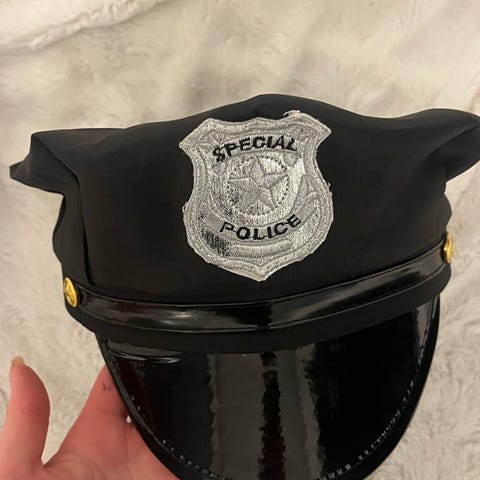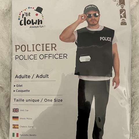 Pakkaukseen kuuluu poliisiasu, johon kuuluu paita ja housut sekä poliisiteemaisia asusteita, kuten vyö ja käsiraudat, sekä poliisi lakki.