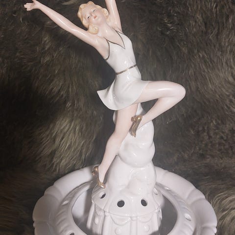 Käsinmaalattu keramiikkainen naishahmofiguuri sinivalkoisella koristelulla. Hahmolla on pistekuvioinen mekko ja kädessä laatikkomainen esine. Pohjassa teksti "Handpainted in USSR" sekä leimamerkintöjä. Sopii esimerkiksi koriste-esineeksi hyllylle tai vitriiniin.