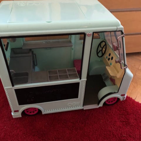 Lelu merkki Our generation iso jäätelöauto. Tämä on siis tarkoitettu isommalle nukelle. Jäätelöautosta löytyy useita tarvikkeita, siinä toimii myös ajovalot sekä vilkut. Auto myös kajauttaa ilmaan musiikkia että ostajat tietävät saapua paikalle ostoksille. Autosta nousee katto, joka helpottaa leikkimistä autossa sisällä. Nyt nukkeleikkeihin mukaan jäätelöauto rikastamaan leikkiä. Vain noudolla Turku/Yli-Maaria