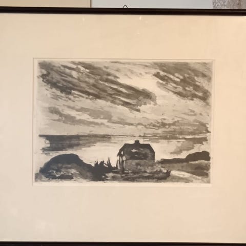 Akvarellitekniikalla tehty maalaus, jossa on esitetty katunäkymä rakennuksineen ja kävelevine hahmoineen, Strängnäs, Ruotsi, 1944. Taiteilijan akvarellit ovat harvinaisia.Teos on pystysuuntaisella paperilla, ja värimaailma koostuu lämpimistä ruskean, beigen ja oranssin sävyistä sekä harmaan ja sinisen vivahteista. Reunassa näkyy käsinkirjoitettu teksti,