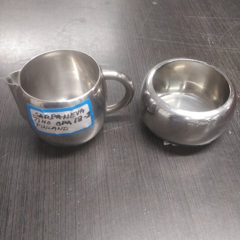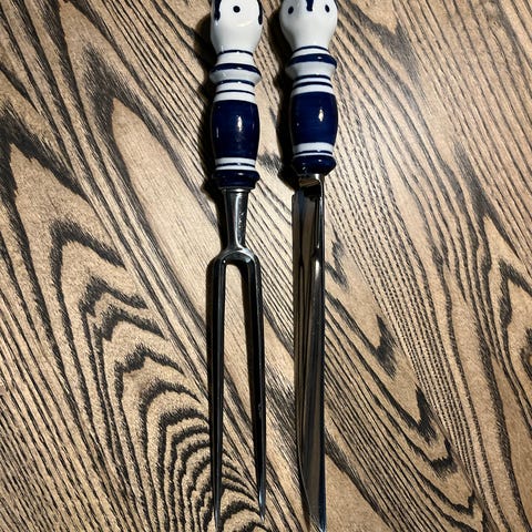 Rosenthal Studio Line sarjan "Siena" ruokailuvälinesetti, jonka on suunnitellut Bjorn Wiinblad 1970-luvulla. Rosenthal salaattiottimet, joissa metalliset lusikka- ja haarukkaosat sekä sinivalkoiset keramiikkakahvat. Sopivat salaatin ja muiden ruokien tarjoiluun. Muutoin oikein hyvässä kunnossa mutta, salaattihaarukan kahvassa on pieni noin 1cm maalihalkeama. Virhe huomioitu hinnassa.