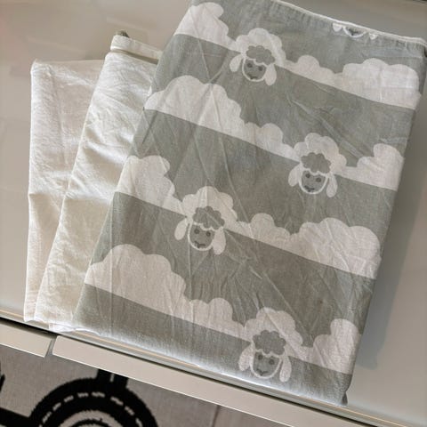 Pussilakana vuoden 2021 äitiyspakkauksesta kettu kuosilla, Vallila. Oli säilytyksestä niin rypyssä että pesin ja silitin nyt ennen myyntiä.