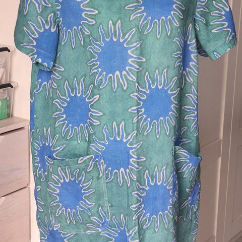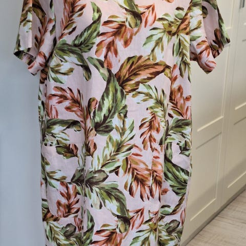 Siisti mekko, pellavaa 55% ja puuvillaa 45%, mitat kainalo-kainalo 51cm, niska-helma 93cm.