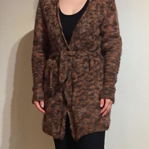 Myyn suunnilleen lankojen hinnalla pois. Materiaali on pehmoinen villa. En ole säilyttänyt langan tietoja mutta itselleni on tärkeää, että lanka ei kutita, ja sellaista tämä on. Värit ovat tummanruskea ja vaalea roosa. Takissa on taskut.
