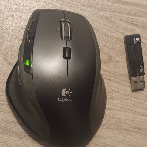 Logitech MX Revolution (M-RCL124) langaton hiiri ja lataustelakka. Toimii Bluetoothilla, eli ei tarvitse erillistä donglea. Ollut pitkään käyttämättömänä, mutta testattu äsken toimivaksi.