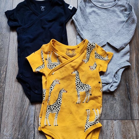 Kolme bodya ja yksi sortsipuku 62 kokoiselle.