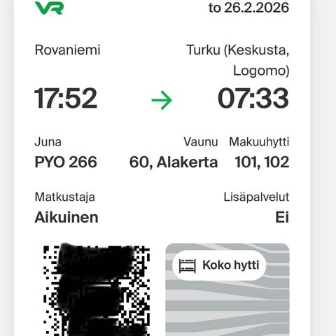 VR autojuna (auto, 2hlöä) Turku-Rovaniemi 17.2.26