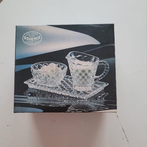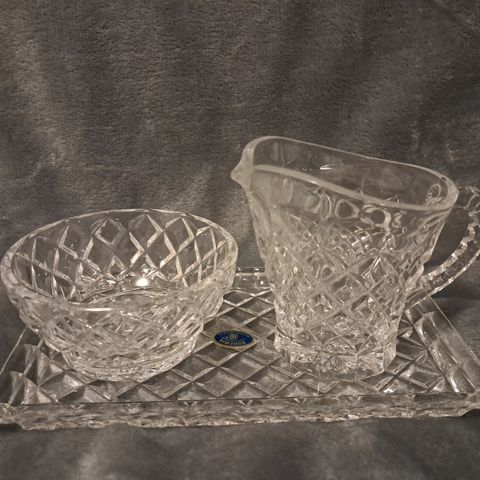 Kaunis ja elegantti kristallinen sokerikko ja kermakko kahvallisina, alkuperäisellä Violetta-merkillä. Valmistettu Puolassa. Runsas hiottu kuviointi, klassinen ja ajaton design. Mukana yhteensopiva kristallitarjotin.