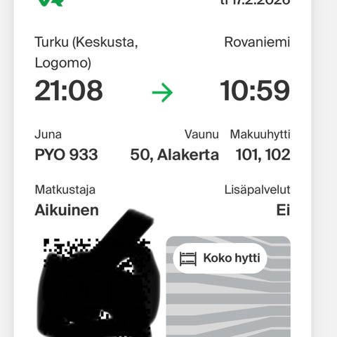 VR autojuna (auto+2hlö hytti) Rovaniemi-Turku 26.2.26