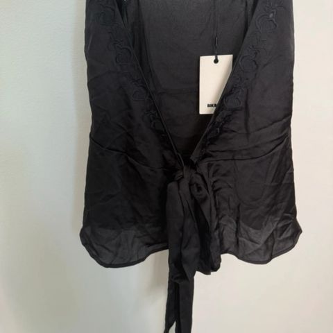 Bik Bok hihaton toppi naisille, koko S. Väri musta. Materiaali päällinen 100 % polyesteriä, vuori 100 % polyesteriä ja yksityiskohdissa nylonia. Topissa on ohuet olkaimet ja V-pääntie. Päällikankaassa on kiiltävä pinta ja koristeompeleita, jotka antavat hieman juhlavuutta. Sopii käytettäväksi sellaisenaan tai esimerkiksi jakun tai neuletakin alla. Hoito-ohjeiden mukaan pestään nurinpäin käännettynä ja hienopesuohjelmalla, jotta materiaali säilyy hyvänä.