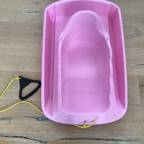 Pinkki pulkka vauvalle. Ulkoreunassa särö, oikein käyttökelpoinen. Vyö on kätevä.