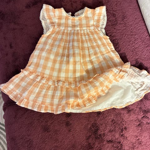 Newbie mekko, koko 80 (noin 9–12 kk) tytöille. Mekko on valmistettu puuvillasta ja siinä on monivärinen, kuviollinen kangas. Mallissa on röyhelöhelma ja olkaimissa röyhelöyksityiskohdat. Edessä on napitus ja vyötäröllä kevyesti poimutettu leikkaus. Soveltuu arki- ja juhlakäyttöön pienelle lapselle.