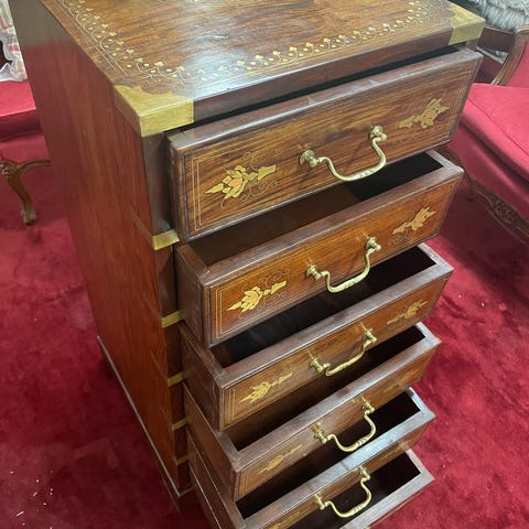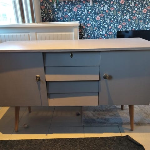 Täyspuinen vanha piironki soikealla peilillä. Toisesta kaapista puuttuu lasi ja toisesta ovesta vedin. Muuten ehjä.