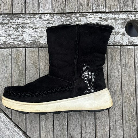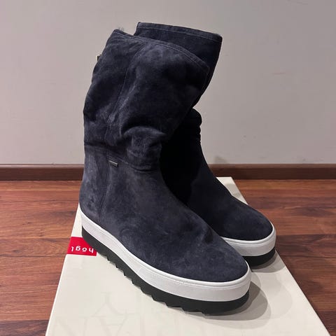 Högl talvikengät, koko 36-37 (4,5) Oranssinruskeat, pohkeen mittaiset varrelliset kengät, joissa vetoketju sivussa. Päällinen mokkanahkaa ja sisäpuolella on lämmin, vaalea tekoturkisvuori.